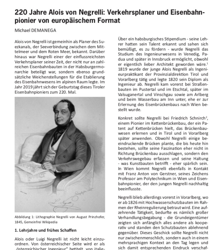 220 Jahre Alois von Negrelli in der Österreichischen Zeitschrift für Verkehrswissenschaft (ÖZV), 3-4 2019.
