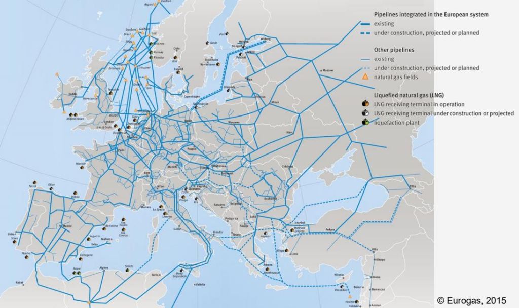 „Die Europäische Union importiert zwei Drittel ihres Erdgases, entweder über Pipelines oder verflüssigt in Tankschiffen (über LNG-Terminals). Mehr als ein Drittel davon kommt aus Russland, gefolgt von Norwegen, Algerien und Katar. Eine Mehrheit der Mitgliedstaaten ist (fast) völlig von Einfuhren abhängig und die Versorgung mancher Länder wird dabei von einem einzigen Lieferanten wie Russland dominiert“ (Link).