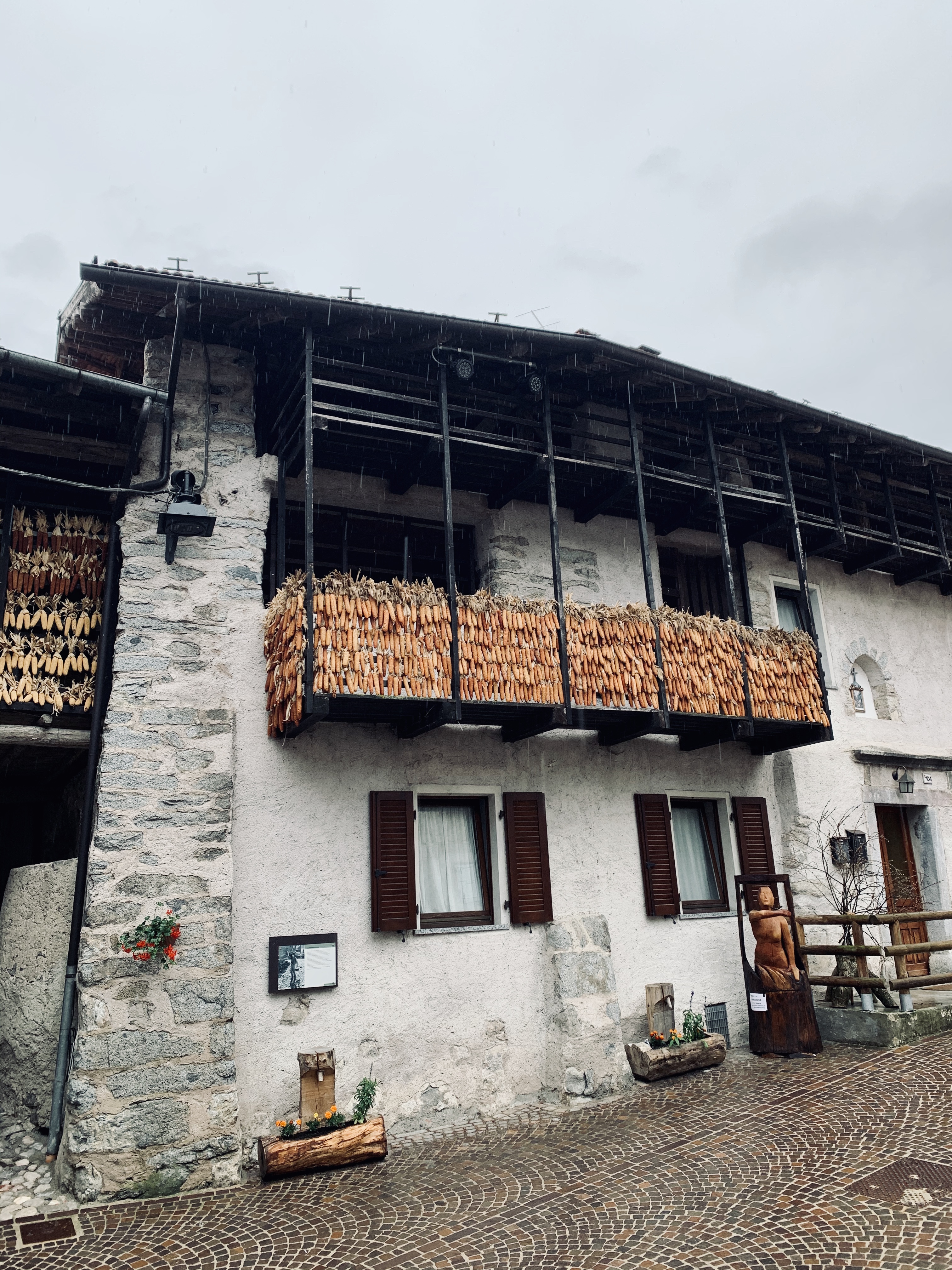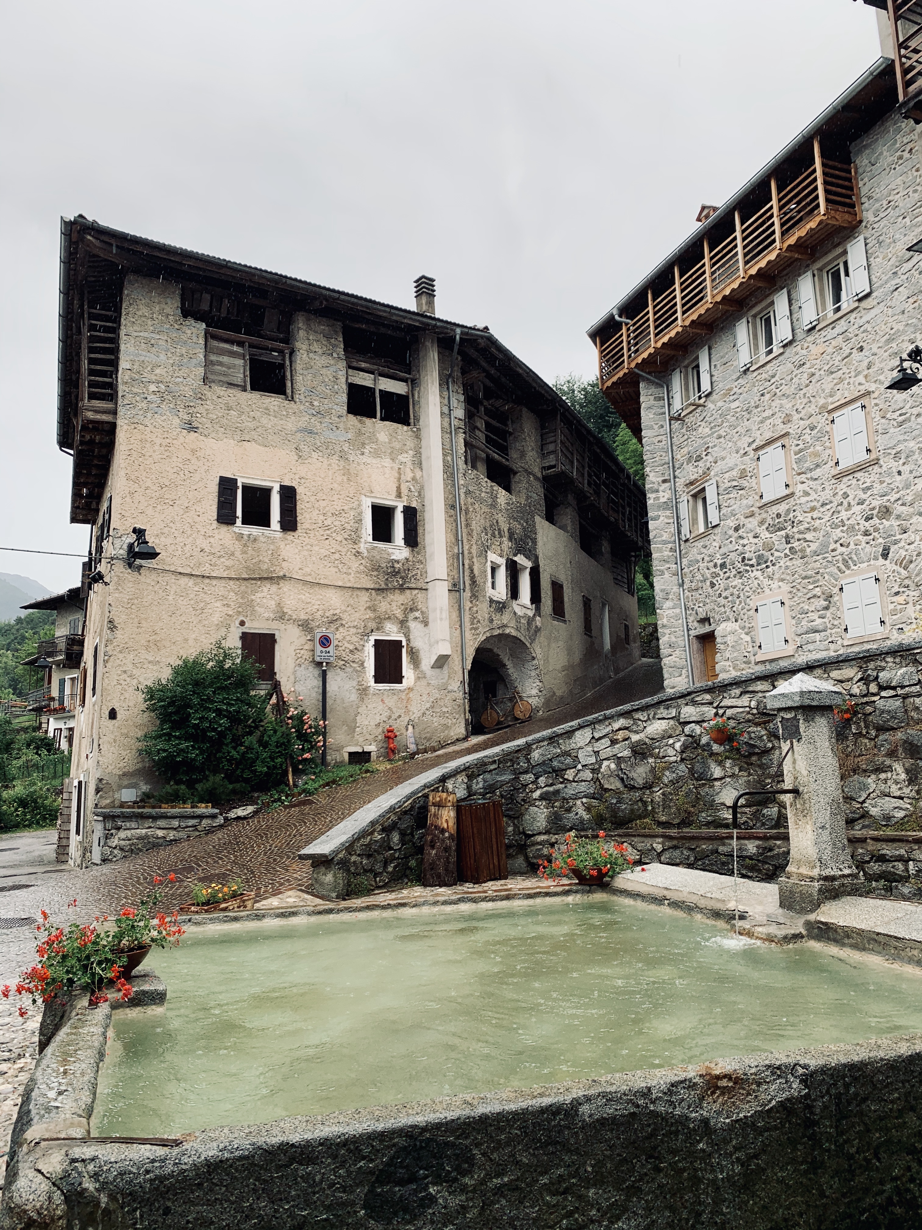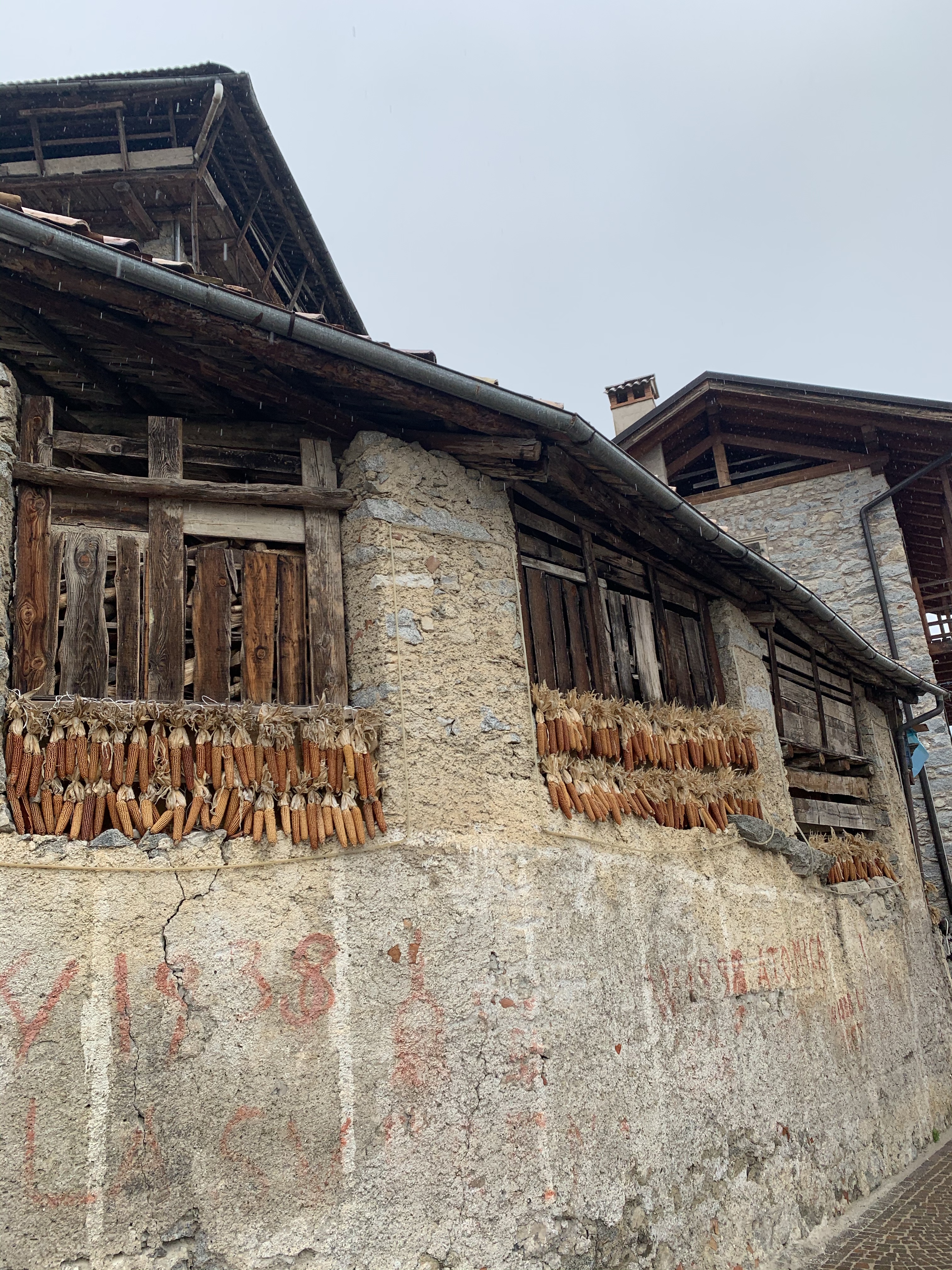 Aber doch, der Einfluss der Renaissance mischt sich sichtbar in den Dorfcharakter: Loggien und Biforienfenster mögen einen venezianischen Einfluss kennzeichnen, ebenso die geschwungenen steinernen Balkone mit eisernen Brüstungen. Die vielen marmorgerahmten Torbögen haben hingegen etwas „typisch trentinerisches“ [2]. Das offene Giebeldreieck mit der sichtbaren Holzkonstruktion zum Trocknen von Heu hat hingegen eher einen nördlichen und Tiroler Charakter.