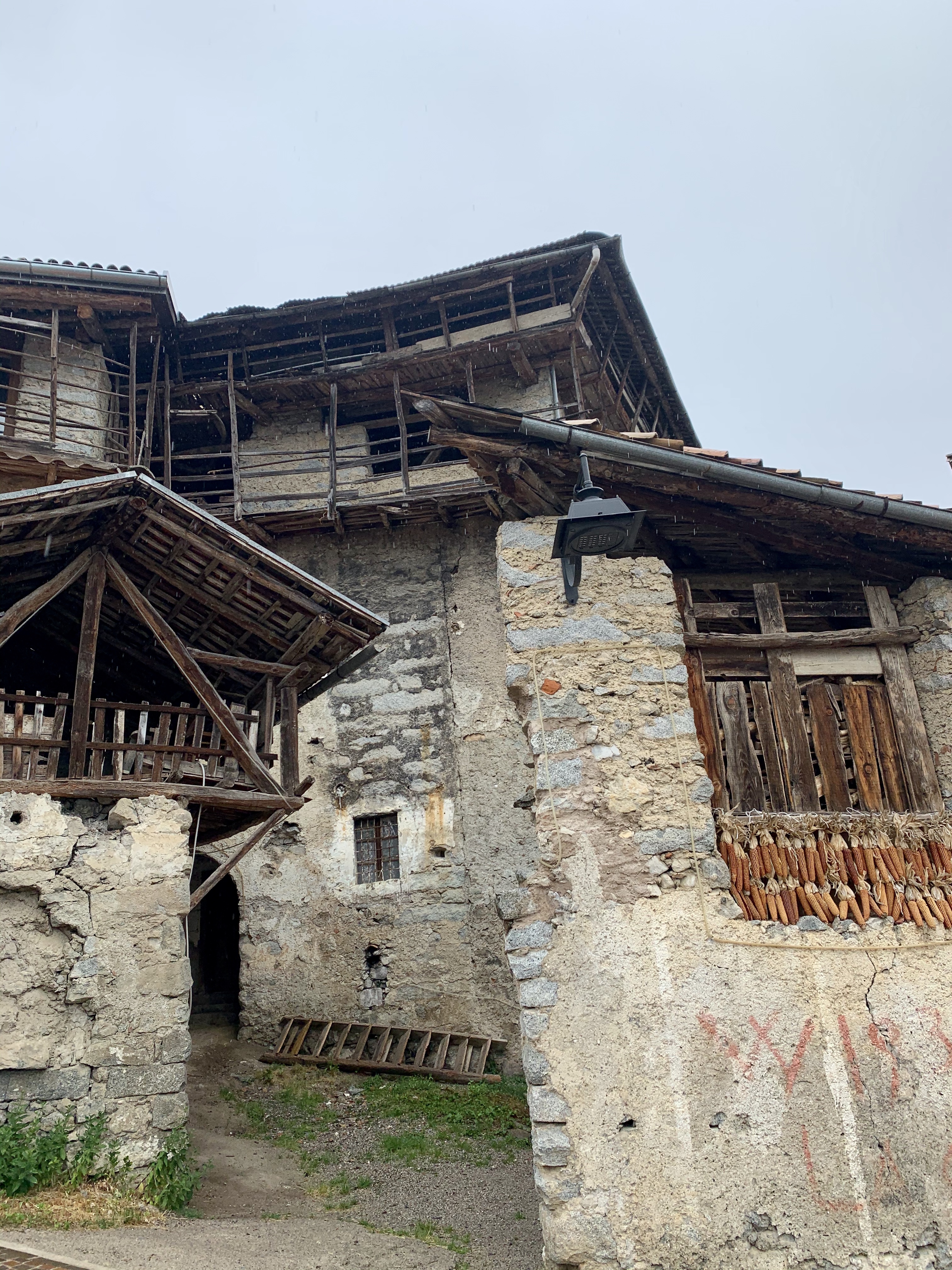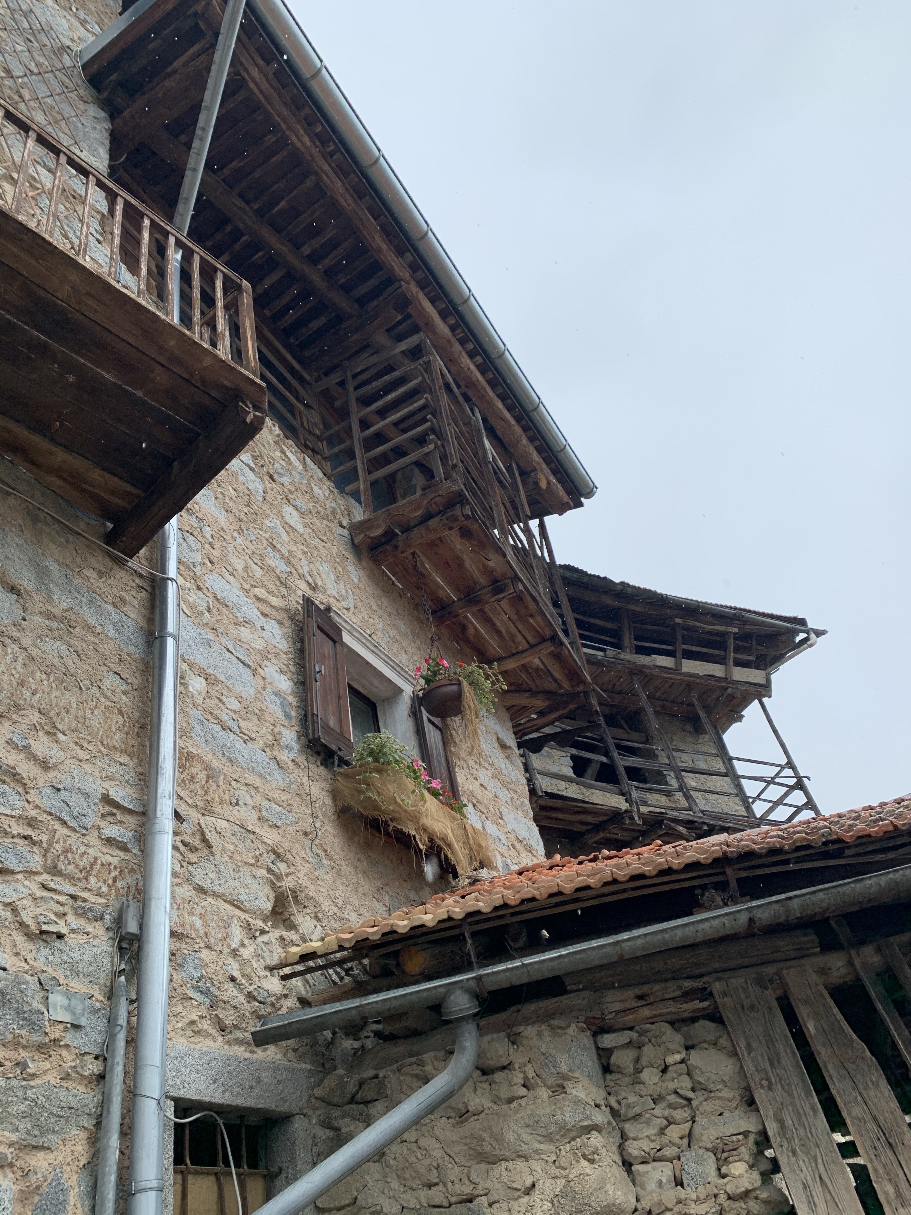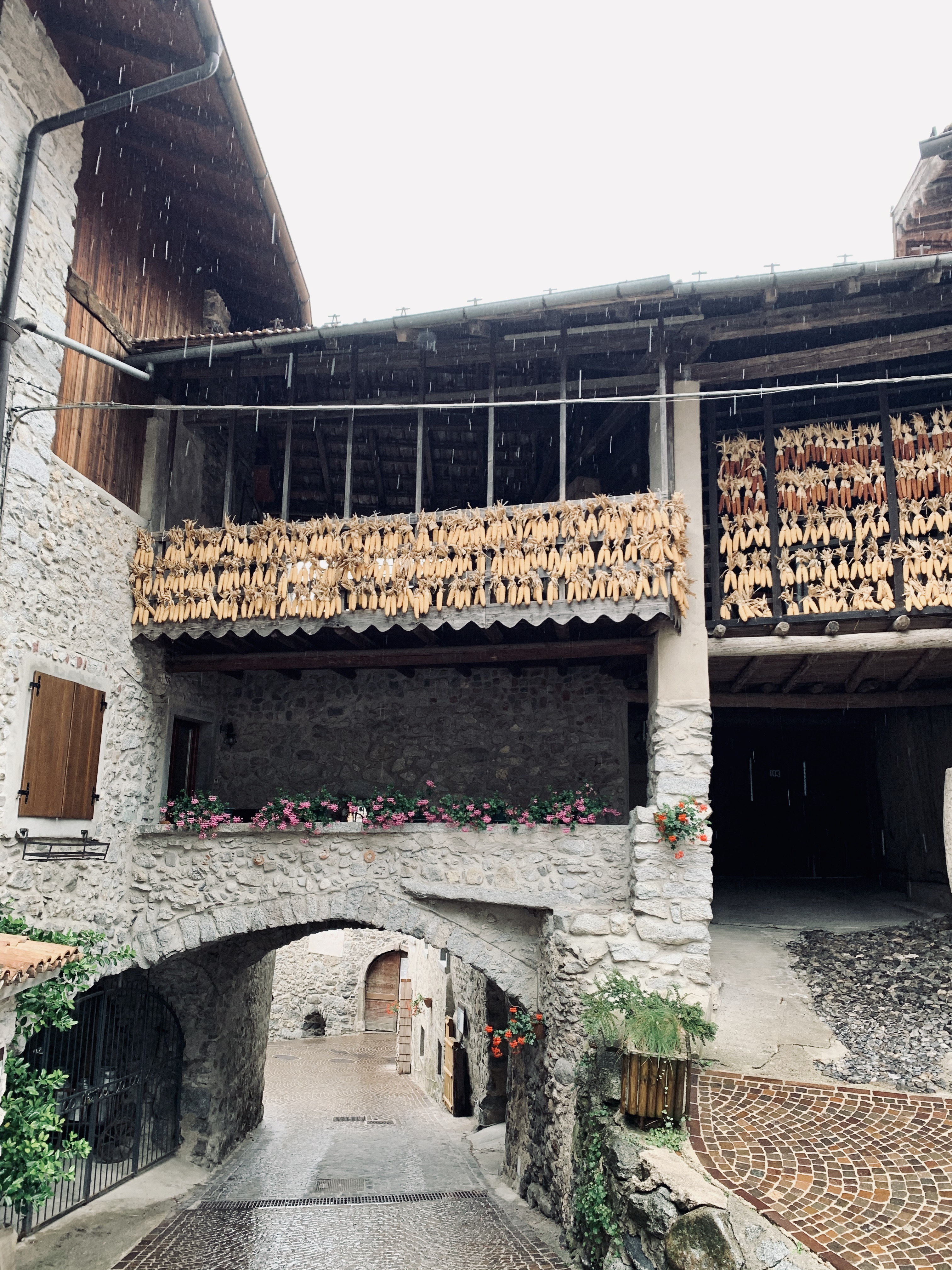 Aber doch, der Einfluss der Renaissance mischt sich sichtbar in den Dorfcharakter: Loggien und Biforienfenster mögen einen venezianischen Einfluss kennzeichnen, ebenso die geschwungenen steinernen Balkone mit eisernen Brüstungen. Die vielen marmorgerahmten Torbögen haben hingegen etwas „typisch trentinerisches“ [2]. Das offene Giebeldreieck mit der sichtbaren Holzkonstruktion zum Trocknen von Heu hat hingegen eher einen nördlichen und Tiroler Charakter.