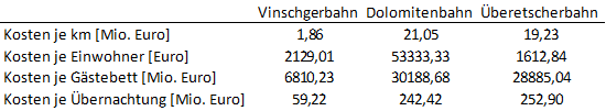 Für den direkten Vergleich von Interesse sind die relativen Daten der Baukosten in Bezug auf Streckenlänge, Einwohnerzahl und touristische Daten.