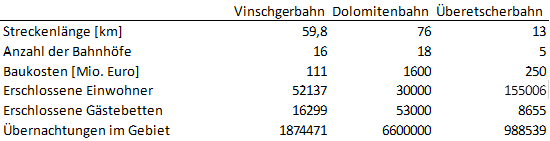 Nachfolgend erfolgt der Vergleich zwischen Dolomitenbahn, Vinschgerbahn und Überetscherbahn in tabellarischer Form.