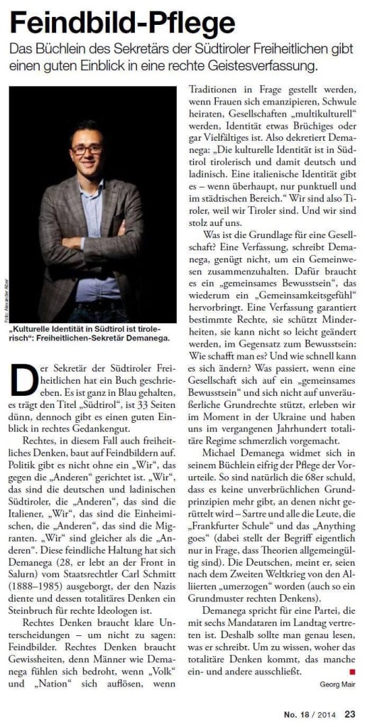 Das Werk „Südtirol“ wurde im Mai 2014 in tiefer politischer Krise in Südtirol als Skizze eines „anderen“ Südtirols in gedruckter Version veröffentlicht: Eines Südtirols, das nach Unabhängigkeit und Eigenstaatlichkeit strebt, das den Anspruch nach Identität erfüllt und die Auslieferung an die Postpolitik verhindert.