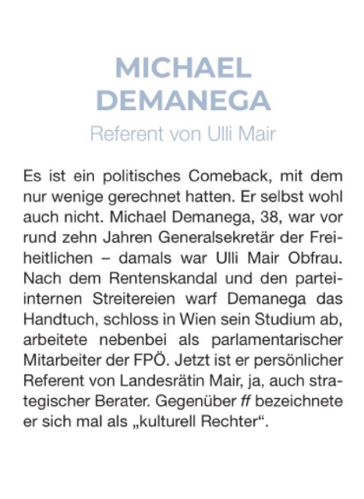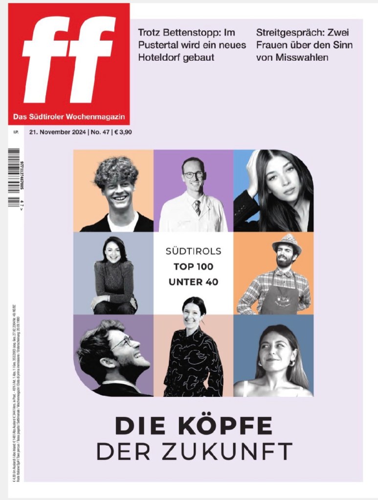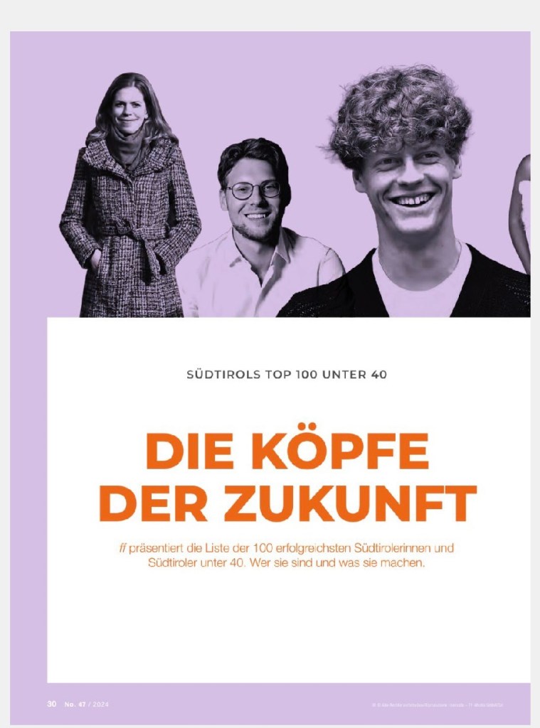 Die FF lehnt sich dabei an Forbes oder Capital an: „Wie sehr junge Menschen beruflich engagiert und zielstrebig sind, das belegt dieses Heft. Erstmals präsentieren wir eine Liste all jener Südtirolerinnen und Südtiroler, die trotz oder wegen ihres noch jungen Alters Außergewöhnliches geleistet haben. Angelehnt an Magazine wie dem englischsprachigen Forbes oder dem deutschen Wirtschaftsmagazin Capital zeigen wir auf den folgenden Seiten erfolgreiche Menschen unter 40, die unser Land prägen. Menschen, die mit ihren frischen Ideen und smarten Lösungen bereits Sichtbares oder Messbares geleistet haben. Engagierte Leute, die lokal oder international erfolgreich sind und sich in ihrer Branche oder auch in der Öffentlichkeit einen Namen gemacht haben.“