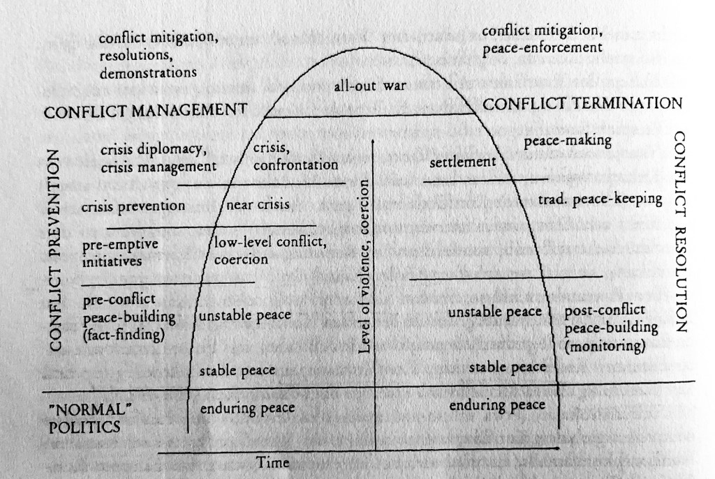 - Konfliktprävention: Dabei sind vier Unterphasen kennzeichnend: a.) Pre-Conflict-Peacebuilding: Unternommen werden umfassende Versuche, spannungsgeladene Konstellationen gar nicht erst zu Eskalation kommen zu lassen. Der Konflikt befindet sich in der Phase der Latenz. b.) Päemptive Maßnahmen („präemptiv“ bedeutet vorbeugend, zuvorkommend): Es handelt sich dabei um Maßnahmen, um einen eskalierten Konflikt auf einem geringen Niveau zu halten. Als Maßnahme gilt hierbei das „fact-finding“, die Darstellung von eingetretenen Fakten und von potenziellen Eskalationsstufen. c.) Unmittelbare Krisenprävention und d.) Krisendiplomatie: Zeichnet sich eine militante Auseinandersetzung ab, wird diese auch bereits politisch vorgetragen, dann ist die Krisenprävention erforderlich.
