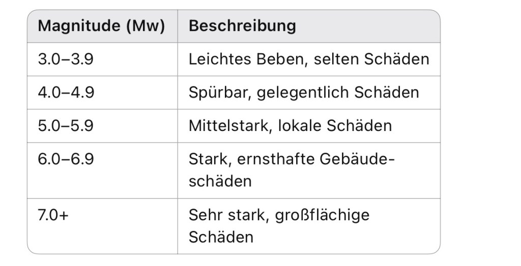 Magnitudenskalen: Die Magnitude beschreibt die bei einem Erdbeben freigesetzte Energie – unabhängig davon, wo man sich befindet. Es ist ein objektives, instrumentell bestimmtes Maß. Die häufigste Skala heute ist die Richter-Skala oder die Momenten-Magnituden-Skala (Mw).