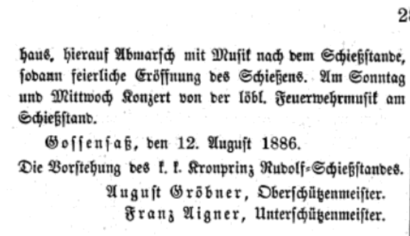 August Gröbner wurde 1893 zum zweiten Mal zum Ortsvorsteher, also Bürgermeister, in Gossensass gewählt, sowie Oberschützenmeister. Das Schützenwesen entsprach dem Prinzip der Landesverteidigung, sodass sich zahlreiche freiheitlich gesinnte Politiker um das Tiroler Schützenwesen verdient gemacht hatten. Die Interpretation der Tiroler Schützen als klerikal-konservativen Verein war hingegen eine gezielte Vereinnahmung.