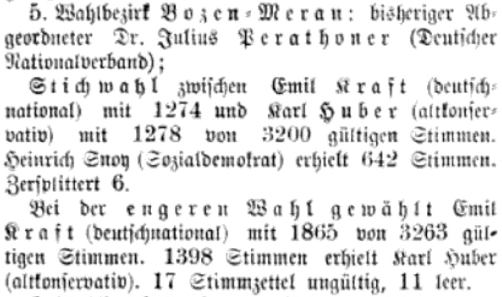 Im Stadt-Wahlkreis 4 (Lienz, Ampezzo, Bruneck, Brixen, Klausen, Innichen, Welsberg, Niederdorf, Toblach, Gossensaß, Sterzing, Gries, Zwölfmalgreien, Obermais) setzte sich der Christlichsoziale Atanas Guggenberger knapp vor dem Deutschfreiheitlichen Josef Rohracher durch. Rohracher war Eigentümer des Aparthotel „Germania“ in Toblach.