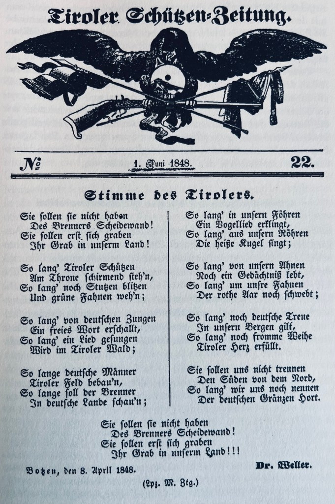 Im Tiroler Wastl wird 1924 das folgende Gedicht Ferdinand Wellers veröffentlicht, das von 1848 stammt: