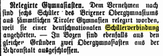 Liest man in den Beständen der Tiroler Tageszeitungen im 19. Jahrhundert, etwa in der Bozner Zeitung vom 25. Jänner 1894, so wird klar, dass die Mitgliedschaft in einer deutschnationalen Schülerverbindung den Verweis aus ALLEN Tiroler Gymnasien zur Folge hatte: