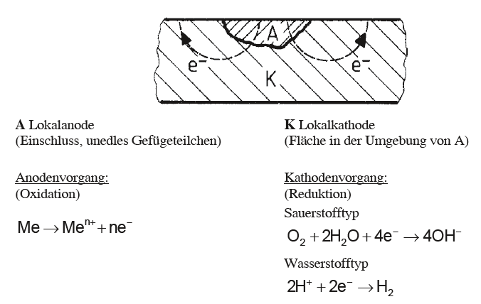 Wird die Korrosion an einem lokalen Element betrachtet, ergeben sich die folgenden Gegebenheiten und Prozesse. Die unedle Metalloberfläche bildet die Lokalanode (A) und die edlere Metalloberfläche der Umgebung die Lokalkathode (K). Während an der Lokalanode ein Oxidationsvorgang Metallionen freisetzt, wandern die im Metall verbleibenden Elektronen zur Lokalkathode und führen dort zu einem Reduktionsvorgang.