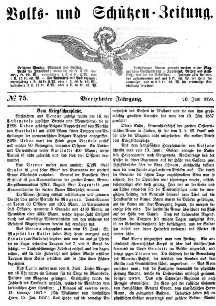 Österreich erlitt am 24. Juni in Solferino die zweite Niederlage. Es folgten Waffenstillstand, Vorfrieden von Villafranca und Frieden von Zürich im November 1859. Österreich verlor zwar Oberitalien, Tirol konnte aber gesichert werden. Italien gelang es weder, die Grenzen Tirols zu überschreiten, noch daraus folgend einen Gebietsanspruch abzuleiten, dem Tiroler Grenzschutz sei dank.