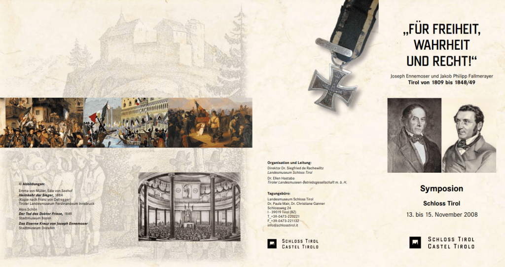 [1] Ellen Hastaba & Siegried de Rachewitz: „Für Freiheit, Wahrheit und Recht!: Joseph Ennemoser und Jakob Philipp Fallmerayer Tirol von 1809 bis 1948/49“ (Schlern-Schriften), Wagner Verlag, Innsbruck 2009