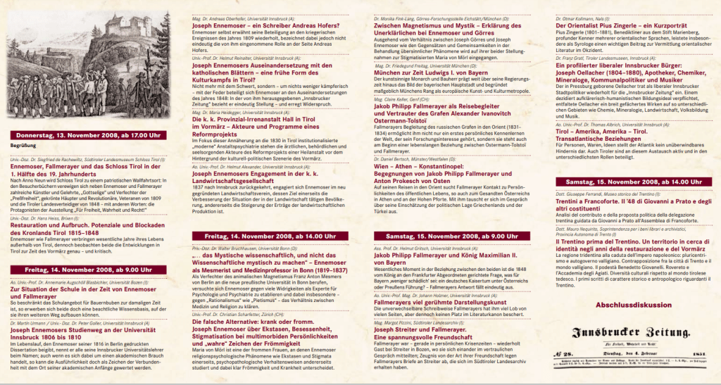 Schloss Tirol befasste sich 2008 mit den historischen Persönlichkeiten Joseph Ennemoser und Jakob Philipp Fallmerayer sowie mit Tirol in den Jahren 1809 bis 1848/49: