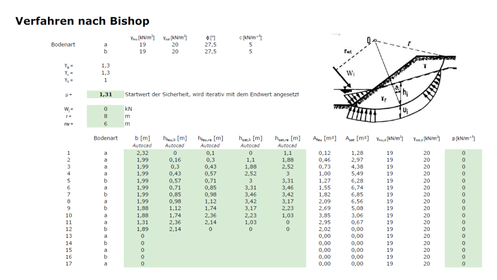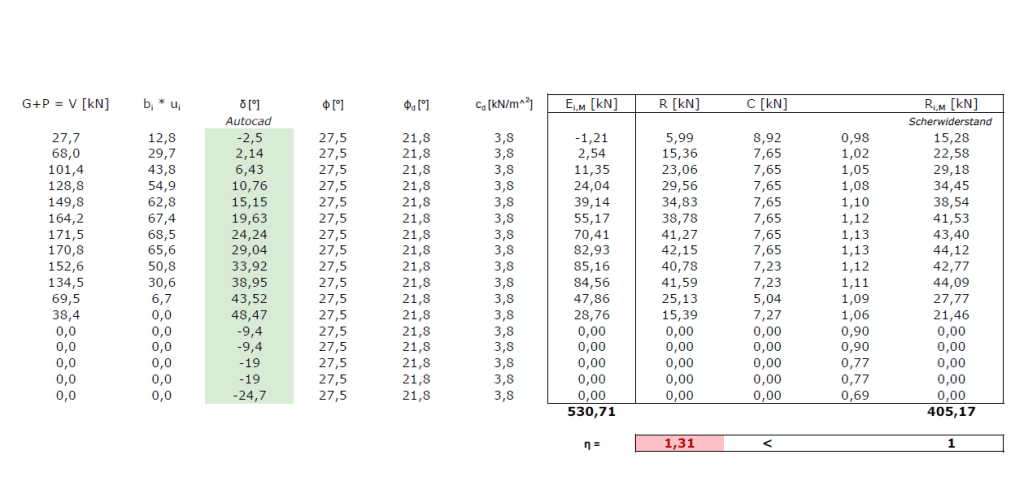 Aufgrund der Komplexität kann die Handrechnung mit Excel allerdings nur eine Kontrollfunktion einnehmen und es wird der Einsatz moderner Geotechnik-Software notwendig.