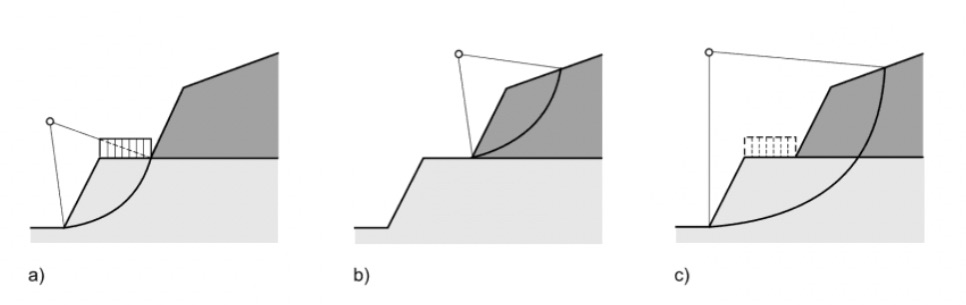 b) Je größer der Anteil der Kohäsion an der Scherfestigkeit ist, desto tiefer schneidet die Bruchfläche in den Boden ein.