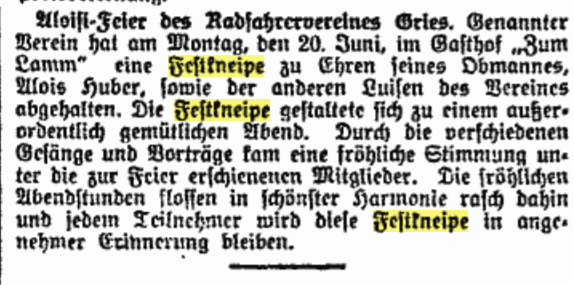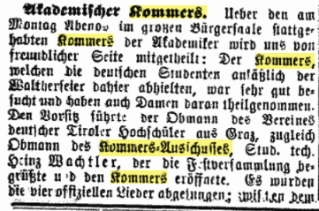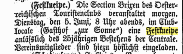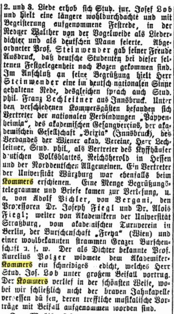 Während man in Tirol – heute – glaubt, eine Feier müsse mit einer heiligen Messe umrahmt werden, die auch noch – zumeist – mehr Zeit einnimmt, als die eigentliche Veranstaltung selbst, gibt es mit Kneipen und Kommersen historische Vorbilder und Alternativen, die die Feier in den Mittelpunkt stellen und ihr eine Würde und einen Rahmen geben.