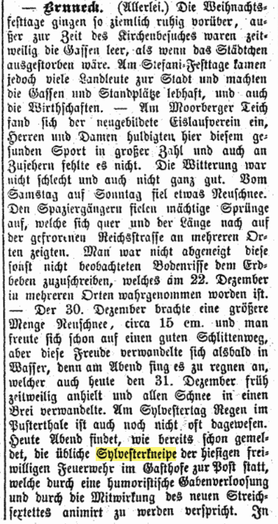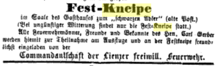 Historisch betrachtet waren Kneipen und Kommerse in Tirol bei Studenten, Akademikern, Turnern, Feuerwehren, Radfahrerclubs, Schützen und Gesangsvereinen üblich. Heute scheint man diese Gemeinschaftsveranstaltungen vergessen zu haben oder vergessend gemacht zu haben. Ein Manko. In diesen Sinne: Heil Neujahr!