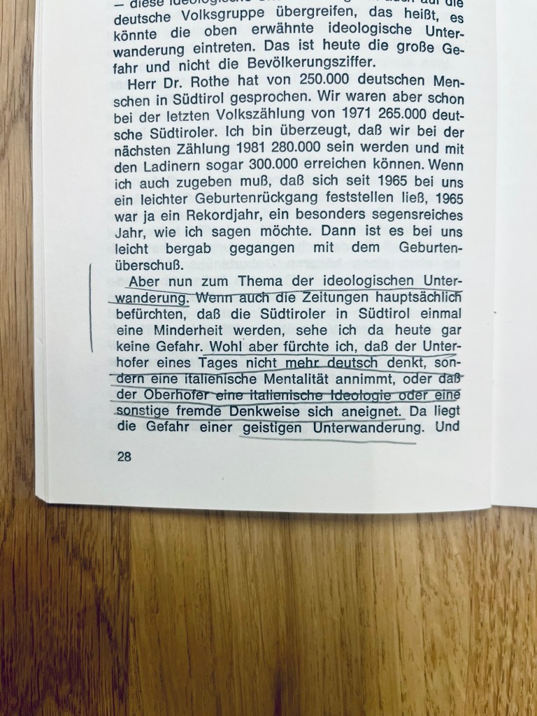 Magnago kommt dann zu einem bemerkenswerten Punkt, nämlich der „ideologischen Unterwanderung“ oder „geistigen Unterwanderung“ der Südtiroler. Die beiden Begriffe verwendet er synonym und grenzt sie explizit von der „kulturellen Unterwanderung“ ab, mit welcher er die kulturelle Überfremdung der Südtiroler meint.