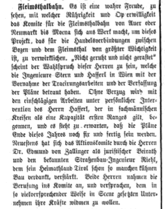 Josef Riehl war es auch, der mit dem Grieser Kurvorstand, dem Rechtsanwalt Edmund von Zallinger, ab 1894 an der Fleimstalbahn von Auer oder Neumarkt bis Moena arbeitete, im Besonderen um das Fleimstal und Fassatal an Bozen zu binden, was dem Wunsch der betroffenen Bevölkerung entsprach.