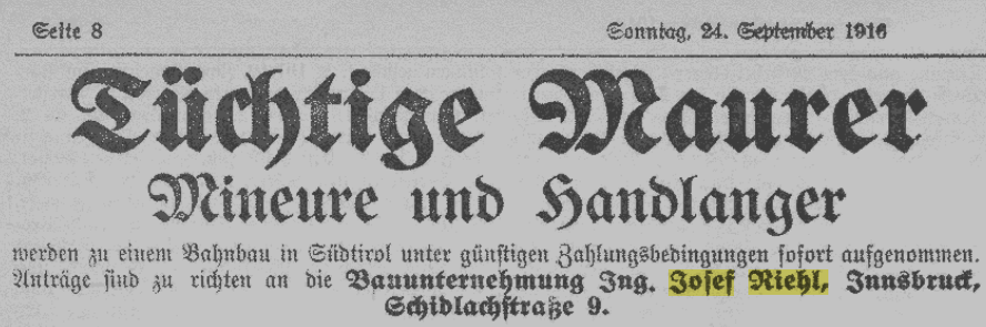 Die 1870 gegründete Baufirma „Josef Riehl“ wurde von Ingenieur Wilhelm von Doderer und den Oberingenieuren Karl Innerebner und August Mayer weitergeführt, erst 1997 wurde die Firma „Innerebner & Mayer“ an die STUAG und an weiter an die STRABAG verkauft.