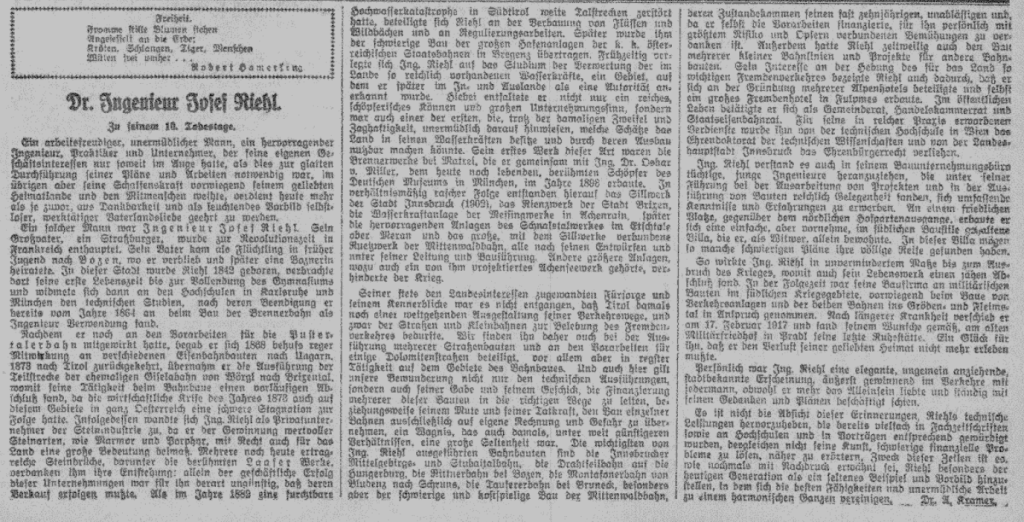 Der Bozner Ingenieur Josef Riehl, der Bruder des Philosophen Alois Riehl, gilt als Eisenbahnvater Tirols und „Landesbohrwurm“. Das Werk der freiheitlichen Bürgermeister Wilhelm Greil (Innsbruck) und Julius Perathoner (Bozen) wäre ohne ihn undenkbar. Sein Hotel Stubai in Fulpmes dekorierte er – nicht zufällig – in schwarz-rot-gold, weiß-rot und weiß-grün.