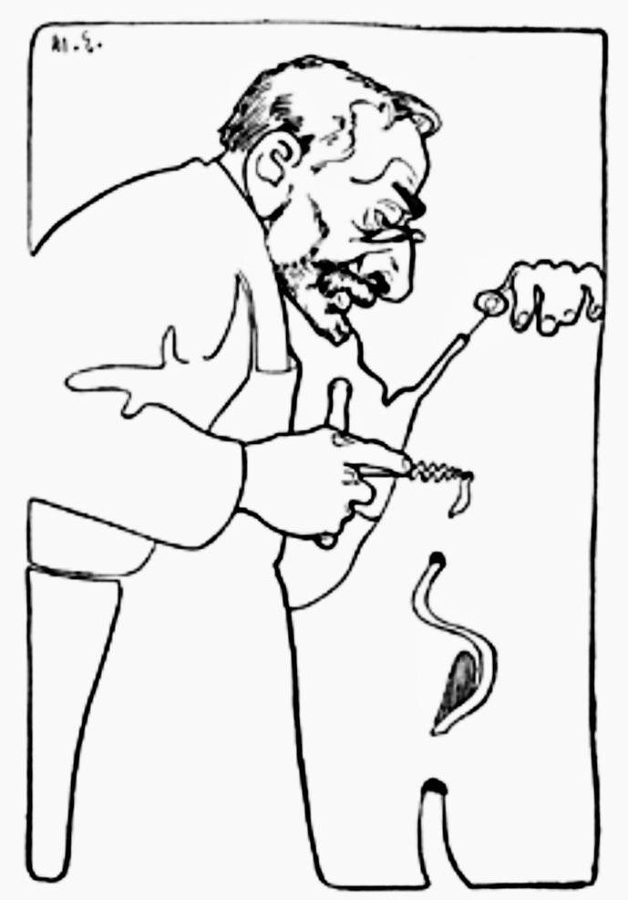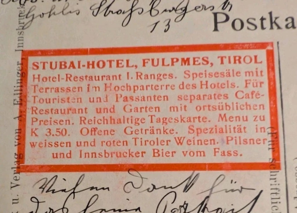 „Vom Restaurationssaal gelangt man in den Speisesaal, der noch größere Dimensionen als der erstere aufweist. Auch ist die Deckenkonstruktion nach altgothischem Muster durchgeführt, denn ein dreiteiliges Tonnengewölbe bringt den mächtigen Raum zum ruhigen Abschluss. Ganz originellen Farbenschmuck tragen die Rundstäbe, und zwar haben jene beim Abschluss der Gesimse die deutschen Farben schwarz-roth-gold, jene beim Zusammentreffen des Hauptgewölbes mit den Seitengewölben die Tiroler Landesfarben weiß-roth, während die Rundstäbe der Durchgänge mit den Farben der Tiroler Schützen grün-weiß geschmückt sind. Wie im Restaurationssaal sind auch hier die Wände vom Fußboden an bis zu einer Höhe von 1,8 Meter mit einer filigranen Vertäfelung verkleidet. Über denselben beginnt wieder die Arbeit des Malers. Als Grundmotiv diente eine ganz modern durchgeführte Komposition von Tiroler Adlern und Edelweiß. Die Stirnseite gegenüber dem großen Bogenfenster bringt wieder ein überraschendes Bild […]. Man fühlt sich an einen Waldsaum im Schlickerthale versetzt und meint förmlich die erquickende Almenluft einzuathmen; das lebhaftere Grün der Lärchen hebt sich gegen das dunklere der Zirbelkiefern trefflich hervor, während der Durchblick durch den Waldsaum die Schlicker Kalkkögel in ihren abenteuerlichen Formen zeigt. Man meint den heiligen Gottesfrieden zu fühlen, der in unserem deutschen Walde herrscht, man meint die schroffen Wände unserer Dolomiten zu sehen, welche der Gemse noch als letzte Heimstätte geblieben sind. Hier findet man echte und rechte Sezession in getreuer Anlehnung an die größte Künstlerin – die Allmutter Natur […]. In gleich origineller Weise wie die beiden großen Säle, die Vorhalle und der Rauchsalon, sind auch die Restaurationslokale im Erdgeschosse und sämtliche Zimmer im Hotel mit eigenartigen Dekorationsmalereien geschmückt.“