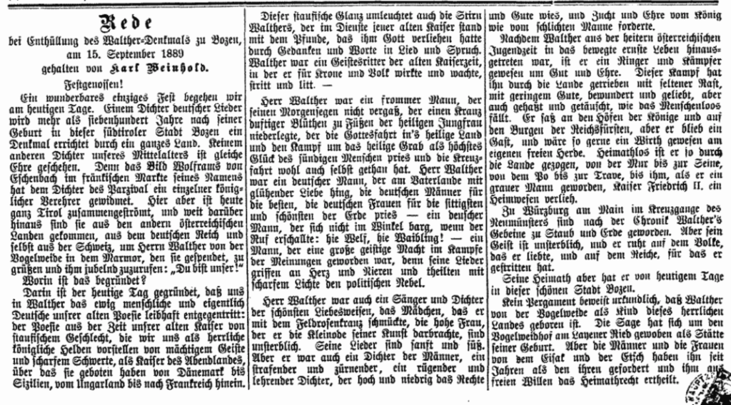 In seiner Rede hob Weinhold hervor: „Wir begehen heute ein wunderbar glänzendes Fest für den Dichter deutscher Lieder. Kein anderer Dichter des Mittelalters wurde so geehrt! Ganz Tirol, Österreich, Deutschland, selbst die Schweiz ist hier vertreten, Walther zu huldigen, ihm zuzurufen: Du bist unser! Bei Walther finden wir das ewig Menschliche und das eigentümlich Deutsche verkörpert. Wir begegnen der Poesie der Zeit der mächtigen Staufen, als des Heldenstammes, der von Dänemark bis Neapel und von Ungarland bis zur Seine gebot. Von diesem Glanz umleuchtet ist auch Walther, der tapfer für die Krone stritt, dafür Freud‘ und Leid ertrug. Walther war aber auch ein frommer Mann, der seinen Morgensegen nie vergaß und einen Kranz duftiger Blüten zu den Füßen der Gottesmutter niederlegte. Sein höchstes religiöses Ziel war die Kreuzfahrt ins heilige Land mitzumachen. Walther war vor allem ein deutscher Mann. Er pries die deutschen Männer als die besten, die deutschen Frauen als die sittsamsten und schönsten; seine Lieder sind süß und milde, aber auch streng und strafend; sie brachten helles Licht in die politischen Wirren jener Zeit„.