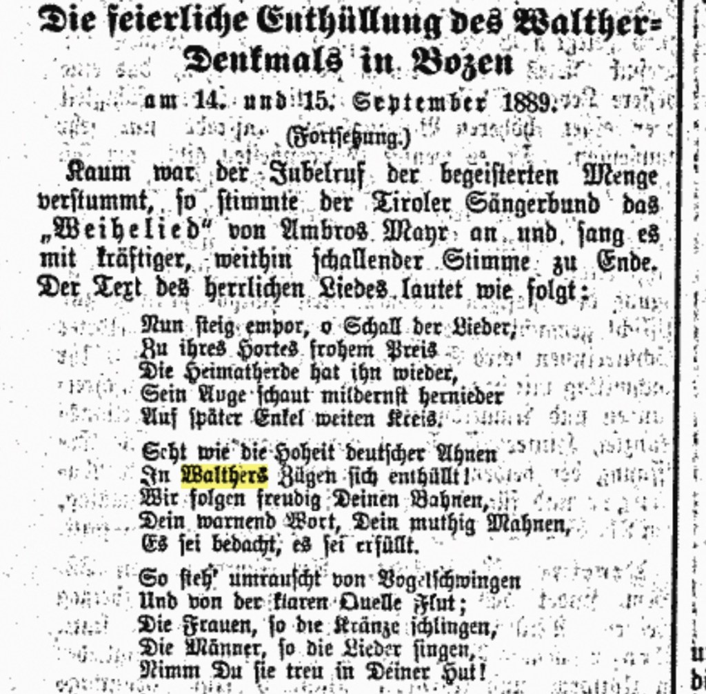Und weiter: „Herr Walther von der Vogelweide barg sich nicht in den Winkel, wenn der Ruf erscholl: „Hie Welf, hie Waiblingen“ – Fürsten und Königen gegenüber war Walther ein strenger Sittenrichter. Heimatlos durchzog der Sänger die Lande, er blieb ein Gast und wär gern Wirth gewesen, bis er endlich gealtert in Würzburg eine Ruhestätte fand. Aber Walthers Geist lebt fort im Volke, das er liebte; nach Jahrhunderten hat der edle Sänger eine Heimat hier im schönen Bozen gefunden. Sein Heimatschein ist dies Marmorbild! Hier, wo deutsches und welsches Wesen aneinander grenzen, möge er ein Markwart sein deutscher Sprache, Ehr und Sitte. Wir begehren nichts Fremdes, aber den eigenen Herd, auf dem die Flammen des deutschen Geistes lodern, diesen wollen wir immer behalten, was unser ist von den Vätern her bis zum letzten Blutstropfen. Ihr Männer von Tirol! Gelobet, dass diese Berge und Thäler deutsch bleiben, und ihr Frauen stimmet ein! So empfange, Walther, dies Gelöbnis! Die heutige Weihe sei ein Wahrzeichen dieser Stadt! Reichster Segen, Zucht und Glaube herrsche alle Zeit hier, das walte Gott!„