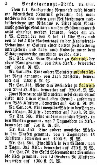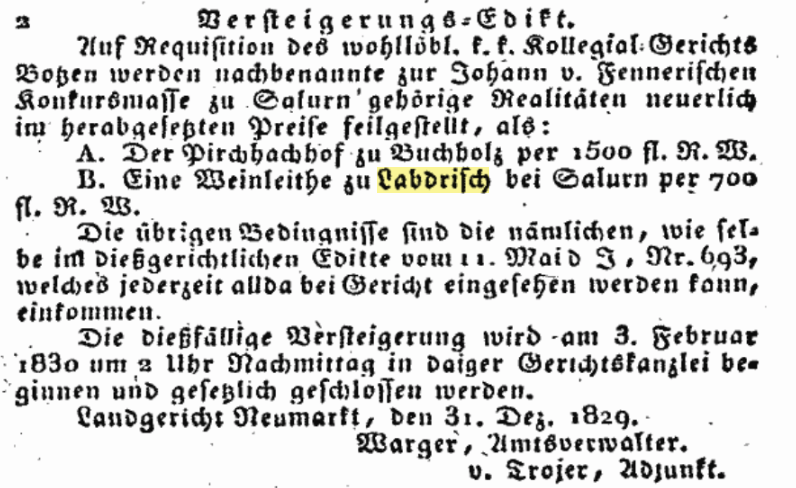Die Johann von Fennerische Konkursmasse zu Salurn wird ab 1829 versteigert, darin findet sich eine Weinleite zu Labdrisch.