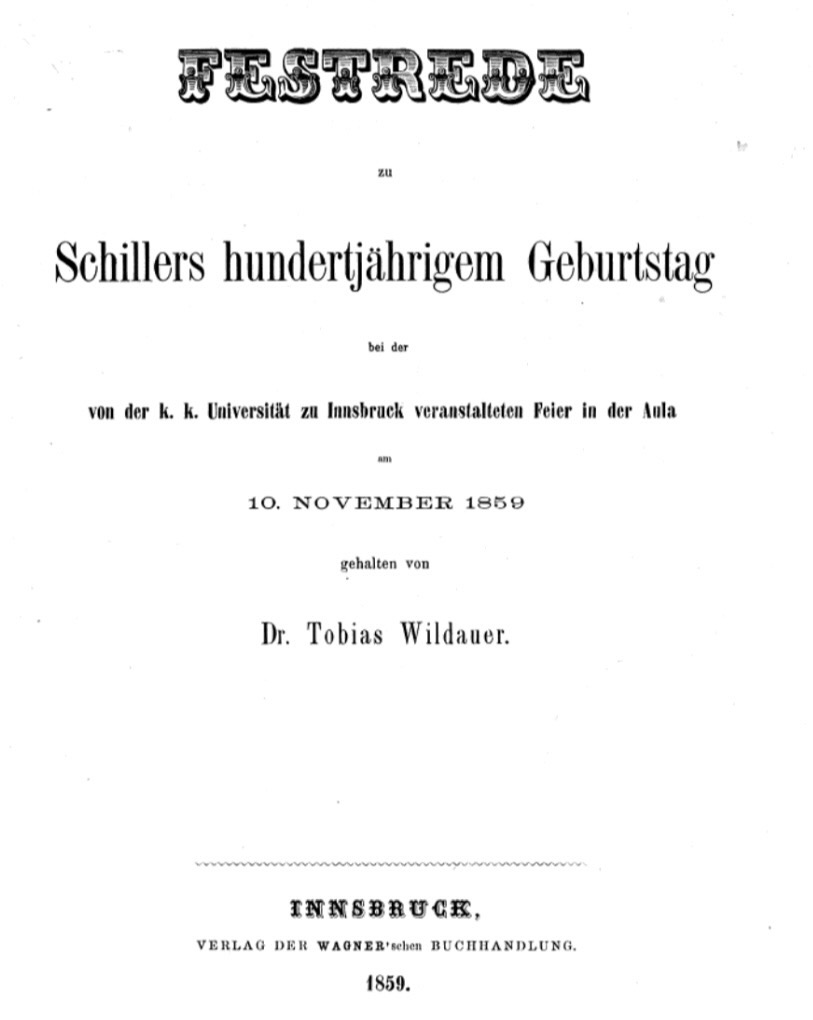 Einen Anfang nahm die politische Biografie Wildauers mit der Rede anlässlich des 100. Geburtstages Friedrich Schillers 1859, um gleichzeitig an den Universitäten, wie jener von Innsbruck, 10 Jahre Revolution von 1848/9 in Erinnerung zu rufen. Zweifelsfrei eine politische Demonstration, gegen Habsburg, für die deutsche Freiheit: