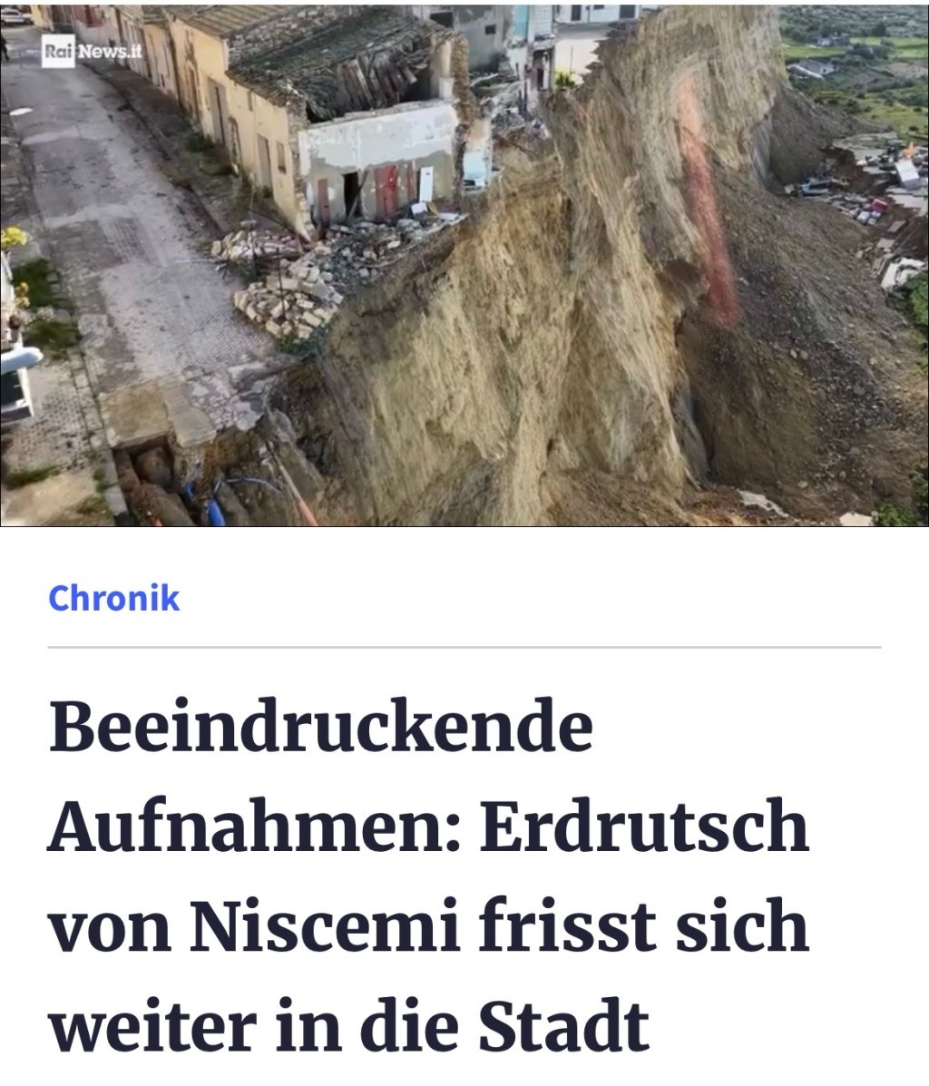 Am 25. Januar 2026 kam es in der sizilianischen Stadt Niscemi (Provinz Caltanissetta) zu einem gravierenden Hangbewegungsereignis, das mehr als 1.500 Menschen zur Evakuation ihrer Häuser zwang und große Teile des Orts am Rand eines sich ausdehnenden Abbruchs zurückließ.