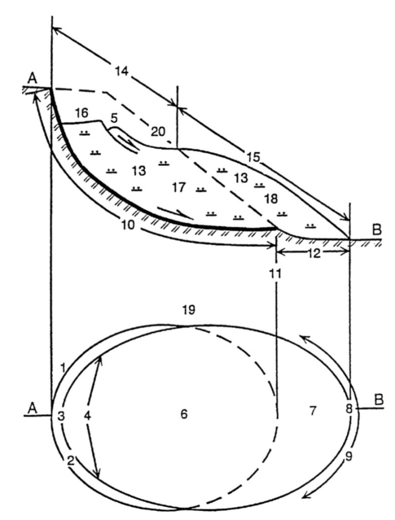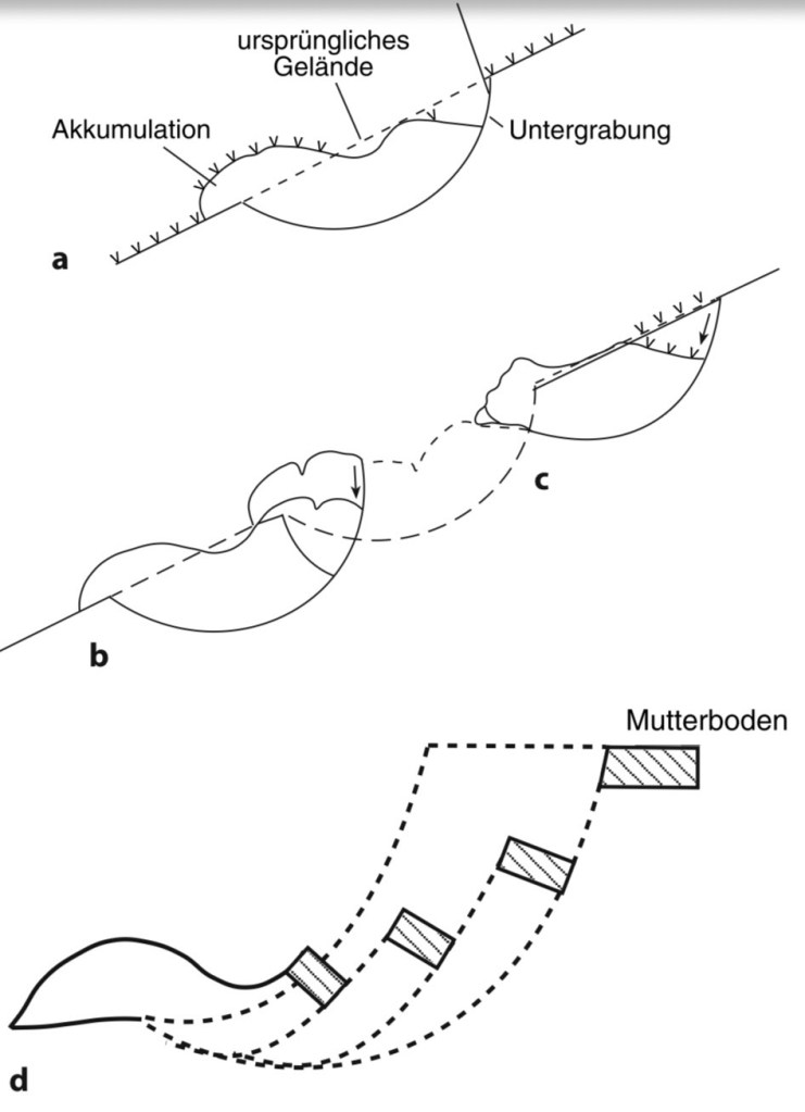 Die vorhandenen Beobachtungen (breite Risse, abgesenkte Bereiche, seitliche Verschiebungen) passen zu einem rotations- und translationsbegleiteten Bodengleiten.