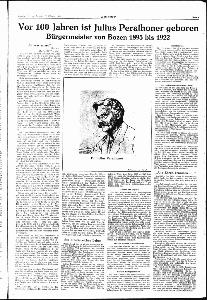 Der Tageszeitung „Dolomiten“ zufolge sei Perathoner nicht nur als Bürgermeister, sondern als Parteimann und als „Führer unseres ganzen Volkes“ zu bewerten.
