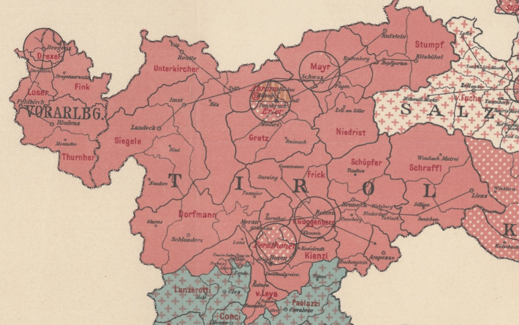 Bedeutend ist dabei der politische Disput zwischen Karl von Grabmayr (Vertreter des freiheitlichen Großgrundbesitzes) sowie Julius Perathoner (deutschfreiheitlicher Städtevertreter) im Tiroler Landtag. Sowohl Grabmayr als auch Perathoner waren dezidiert deutschnational orientiert, befürworteten – im Gegensatz zu den Klerikal-Konservativen – eine Autonomie und weitgehende Selbständigkeit für Welschtirol und forderten gleichzeitig die notwendige Stärkung des Deutschtums im Etschtal.