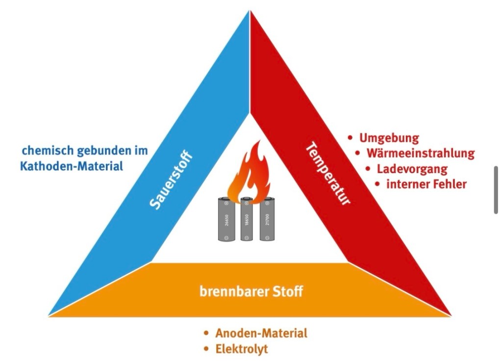 Die verwendeten organischen Lösungsmittel sind chemisch betrachtet brennbare Flüssigkeiten, vergleichbar mit leicht entzündlichen Lösemitteln. Sie enthalten energiereiche Kohlenstoff-Wasserstoff-Verbindungen. Wird die Batterie stark erhitzt, beschädigt oder kommt es zu einem internen Kurzschluss, steigt die Temperatur im Inneren stark an. Ab etwa 70–120 °C beginnen Zersetzungsreaktionen. Dabei entstehen brennbare Gase wie Methan, Ethen, Wasserstoff und Kohlenmonoxid. Wird die sogenannte Zündtemperatur erreicht oder ein Funke erzeugt, entzünden sich diese Gase und damit indirekt auch der verdampfende Elektrolyt.