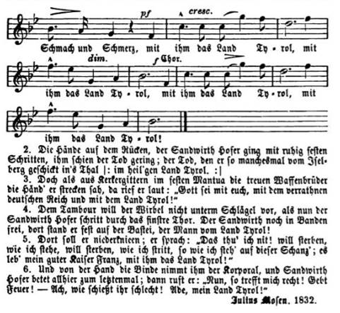 Das war der historische Kontext, in dem der Burschenschafter Julius Mosen 1832 das Lied „Sandwirt Hofer“ schrieb, das als „Zu Mantua in Banden“ bekannt ist.