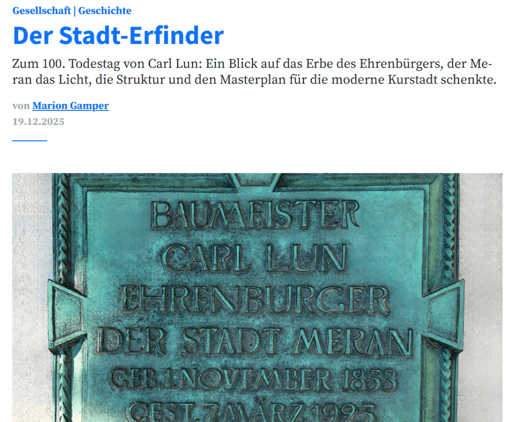 Das Südtiroler Portal „Salto“ bezeichnet Karl Lun als den Mann, „der Meran das Licht, die Struktur und den Masterplan für die moderne Kurstadt schenkte“: