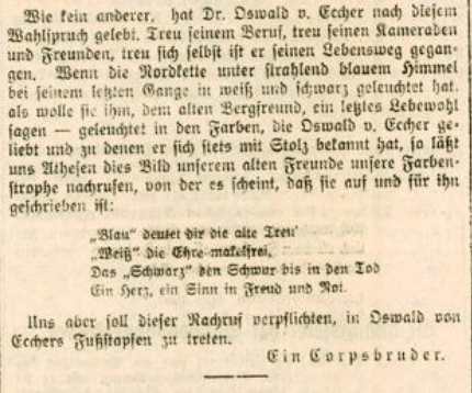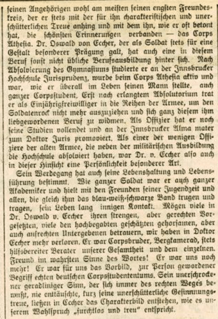 Der Nachruf in den Innsbrucker Nachrichten am 16. Dezember 1935 würdigt das Werk Oswald Ecchers und geht auch auf die persönlichen Eigenschaften ein sowie auf die Leistungen im Corps. Als „ganzer Soldat und ganzer Akademiker“ wird er beschrieben, „treu seinem Beruf, treu seinen Kameraden und Freunden, treu sich selbst“ und als Soldat eine „Gestalt besonderer Prägung“.