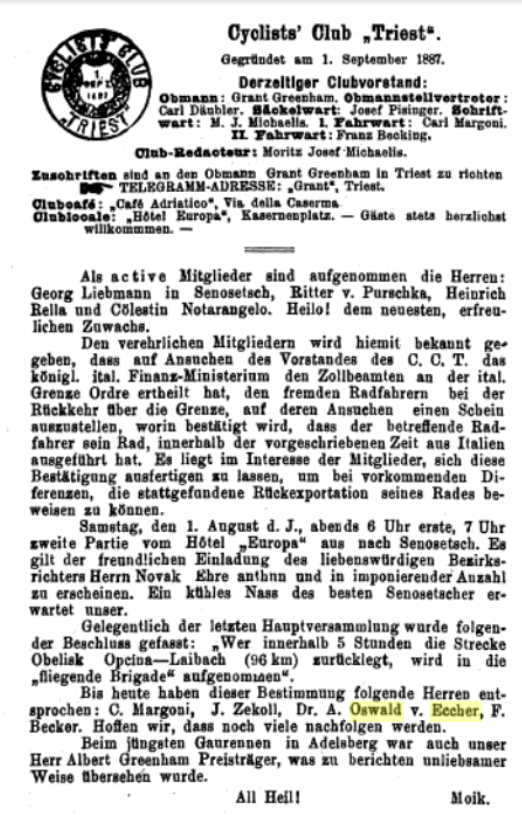 Nach einem Aufenthalt in Triest besuchte Eccher die Kriegsschule in Wien, um zum Oberleutnant aufzusteigen. In Triest wurde er Mitglied des Radfahrerclubs. Die Radfahrerclubs stehen in einer bestimmten Nähe zu den Turnvereinen, an deren deutschfreiheitlicher Gesinnung besteht kaum ein Zweifel. Im Radverein betätigte sich auch Paul von Sternbach.