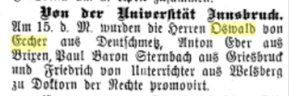Nach Absolvierung des Gymnasiums studierte Oswald Eccher von 1885 bis 1890 Rechtswissenschaften in Innsbruck und wurde Mitglied im Corps Athesia. Seine Zugehörigkeit zum Corps ist am Schmiss unschwer zu erkennen.