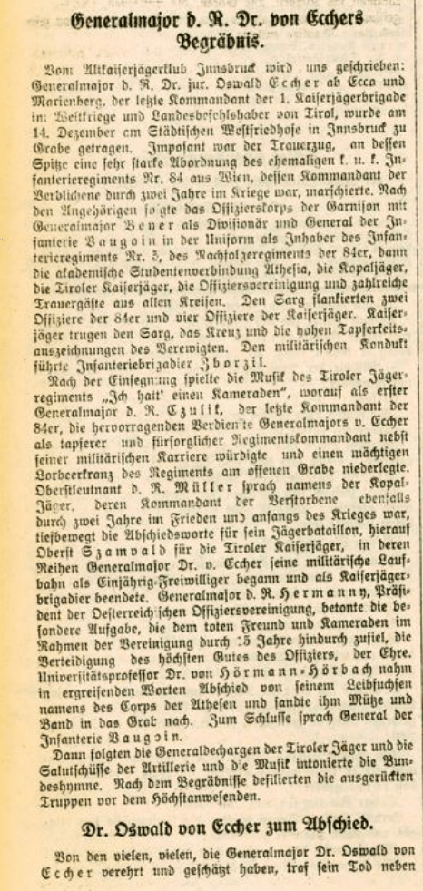Oswald Eccher wurde in Mezzocorona (Deutschmetz) geboren, war Mitglied im Corps Athesia, Kommandant der 1. Kaiserjägerbrigade und militärischer Landesbefehlhaber in Tirol sowie Militäresxperte im Nationalrat, wo er im November 1918 die aussichtlose Lage der österreichischen Truppen darlegen musste.