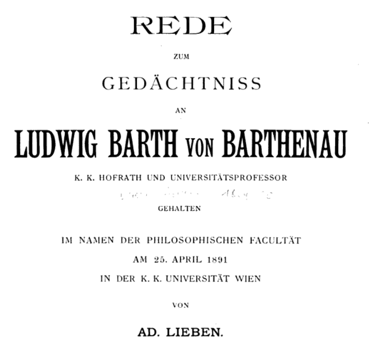 [3] Adolph Lieben: „Rede zum Gedächtniss an Ludwig Barth von Barthenau; gehalten im Namen der philosophischen Facultät am 25. April 1891 in der K. K. Universität Wien“, Wien 1891