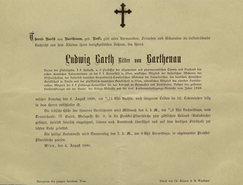 Adolph Lieben, ebenso Professor für Chemie, lehrte in Wien, Palermo, Turin, ordnete Barth in seinem Nachruf 1891 politisch ein: „In politischer Beziehung gehörte Barth mit großer Entschiedenheit der liberalen Partei an und war ein strammer Widersacher der Ultramontanen, die in seinen heimatlichen Bergen einen so dominierenden Einfluss besitzen“ [3]. Ludwig Barth war folglich ein Deutschfreiheitlicher, wie konnte es – mit Blick auf die Biographie – auch anders sein.