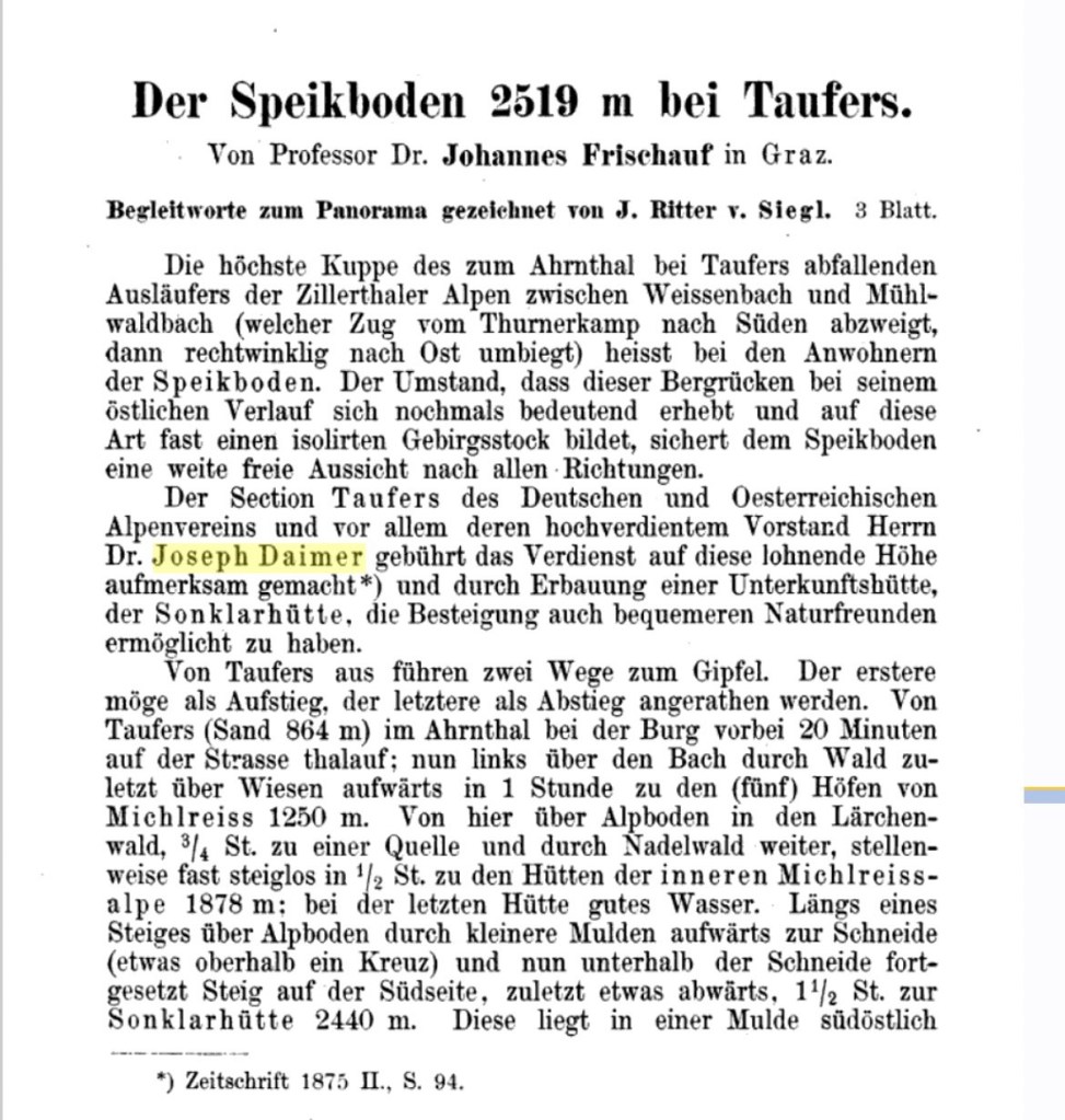Die Erschließung der Tauferer Berge hängt wesentlich mit einem Namen zusammen: Josef Daimer. Sängerschafter, Corpsstudent, Alpenvereins-Aktivist, Arzt und Ministerialrat.