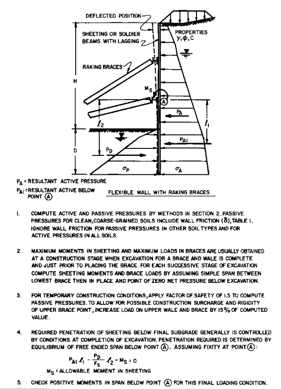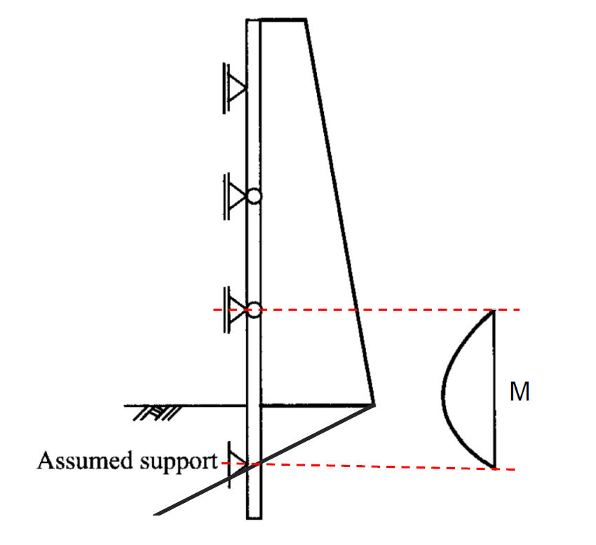 Die NAVFAC 1986 geht bei mehrfacher Stützung von folgendem Ansatz aus: „Bei fortschreitender Ausführung, insofern der Aushub bis zum Einbringen der ersten Abstützung ausgeführt und nach Einbringen der Abstützung fortgeführt wird, werden im Feld und im Einspannungsbereich die maximalen Momente erzielt. Für jede weitere Phase des Aushubs wird eine einfache Abstützung (Einfeldträger) zwischen der untersten Abstützung und dem Nullpunkt des Erddrucks unterhalb der Aushubquote angenommen“.