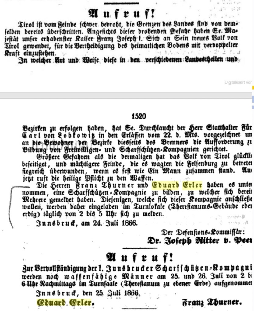 Eduard Erler (der Vater) war Gastwirt „zum grauen Bären“ in Innsbruck. Die beiden Turner Franz Thurner und Eduard Erler organisierten anlässlich des Tiroler Grenzkrieges 1866 freiwillige Scharfschützenkompanien: