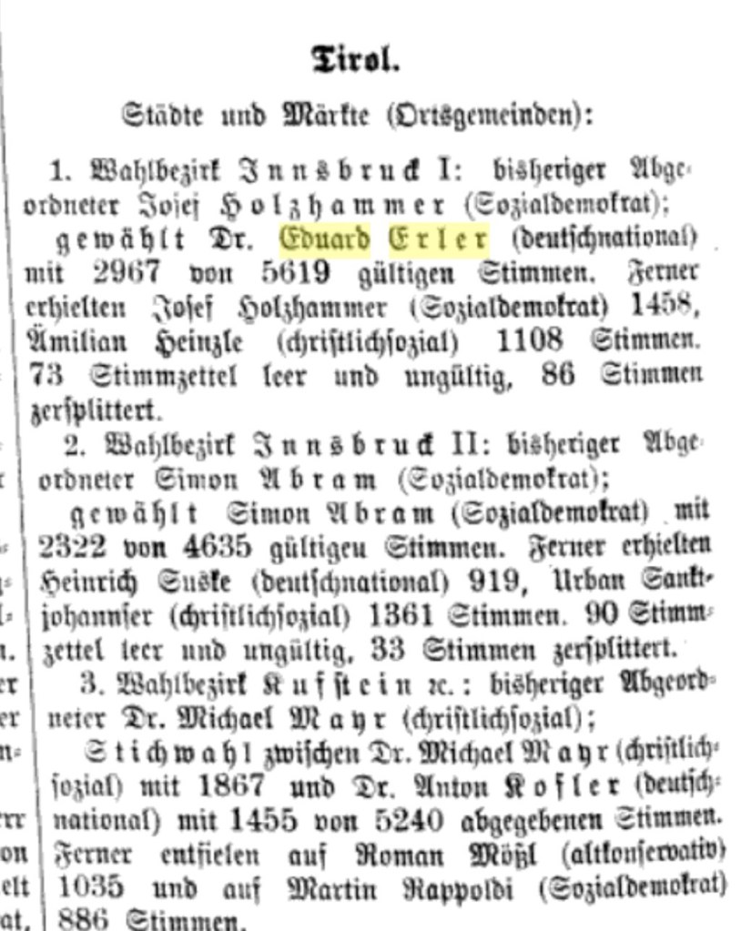Eduard Erler war Rechtsanwalt, Vizebürgermeister in Innsbruck, darüber hinaus aber auch wesentlich an der ideologischen Festigung der Deutschfreiheitlichen beteiligt, unter anderem als Vorsitzender der Jungdeutschen Vereinigung.