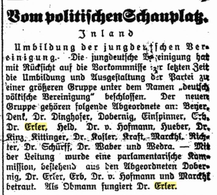 Aus jenen Mitgliedern des Deutschen Nationalverbandes, die keinem parteilichen Verband angehörten, folglich nicht organisiert waren, wurde 1911 die Jungdeutsche Vereinigung gegründet, deren Vorsitz Erler übernahm: