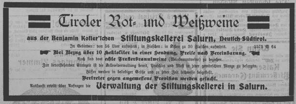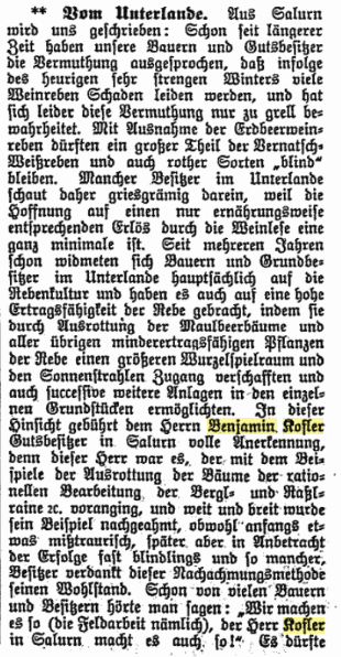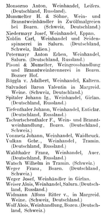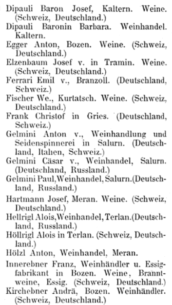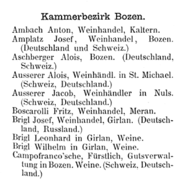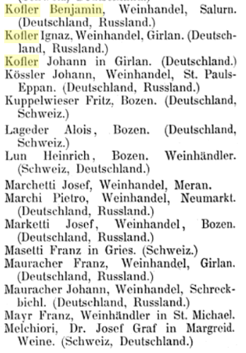 Im Exportkompass 1888/9 des österreichisch-ungarischen Ausfuhrhandels scheinen in der Kategorie Wein im Kammerbezirk Bozen allerlei Persönlichkeiten auf, darunter Benjamin Kofler als Weinexporteur ins Deutsche Reich und nach Russland: